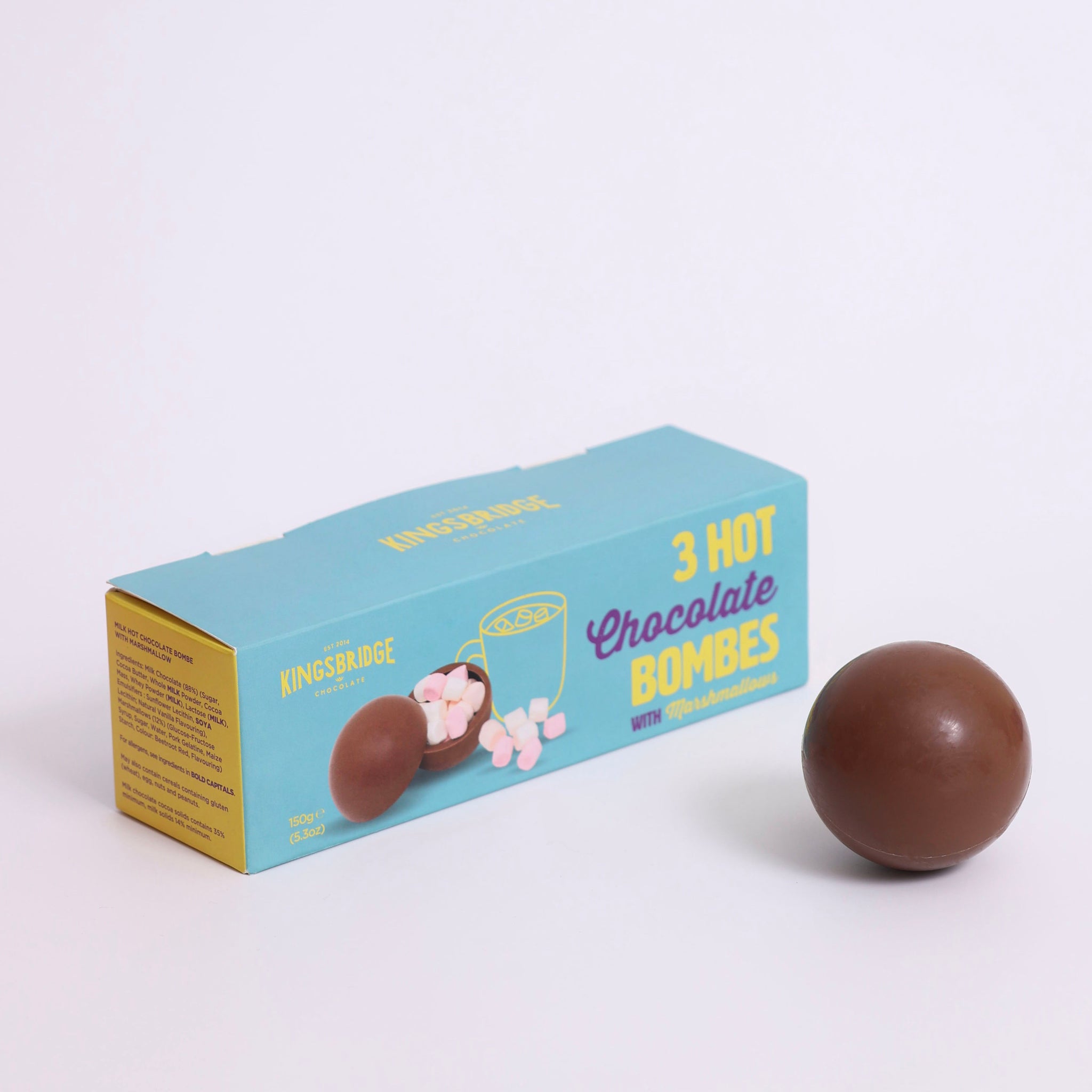 Hollow Belgian milk chocolate balls, with mini marshmallows inside, to make luxurious hot chocolate from, once steaming milk is poured over to melt the chocolate.